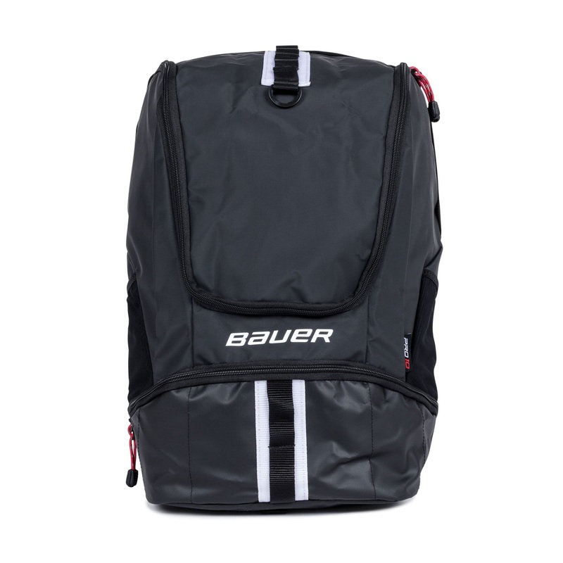 The Bauer Pro 10 Backpack features the same pro tarp material as the Bauer pro bags to maximize durability throughout the school year. These bags feature a sleek look as well as more than enough storage for all your books, snacks and other items. The large main compartment features a wide ?U? opening as well as an internal elastic pocket that doubles as a laptop holder and a smaller zippered accessory pocket to keep you ipod and other small items safe. At the bottom of the bag, a zipper lower storage pocket is perfect for an additional pair of shoes or a change of clothes for the gym after class. Lastly, carrying is made easy and comfortable with a padded back and padded and ventilated shoulder straps.