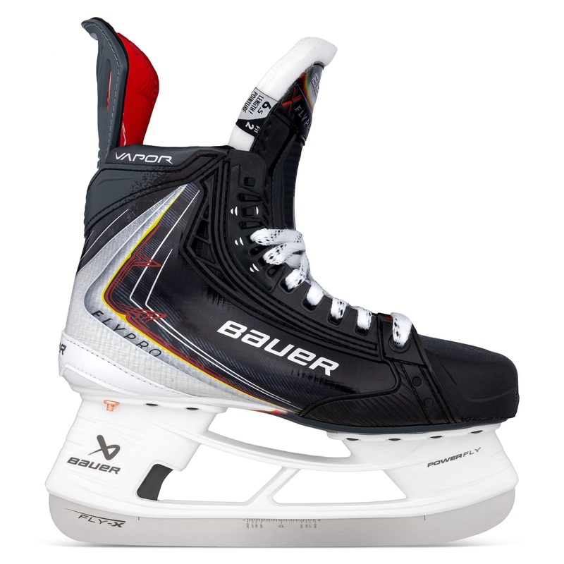 For the 2025 season, Bauer has released the Vapor FlyPro Intermediate Hockey Skate as their elite skate option. The FlyPro is the next upgrade from the previous X5 Pro and offers a wide range of high-end features, including Aerofoam+ ankle padding, a 3D-lasted CURV composite boot, a Hydrolite liner, and the Powerfly holder.