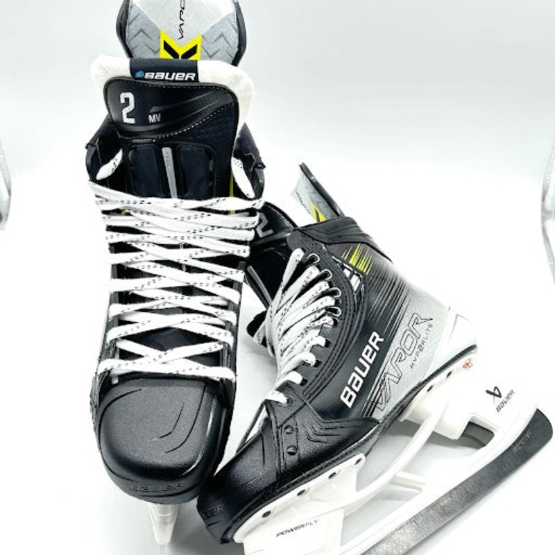 New Bauer Vapor Hyperlite 2 skates from an AHL team. Size 10D with 288 Power Fly holders and Fly TI Steel. The initials MV and the number 2 are featured on each tongue.
