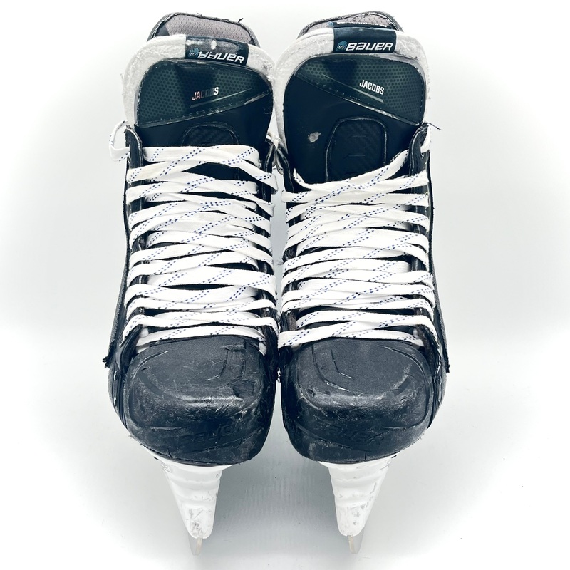USED BAUER VAPOR HYPERLITE HOCKEY SKATEThese skates are in very good condition with general wear with only cosmetic blemishes from use. These skates are also equipped with shot blockers. The name "Jacobs" is also printed onto each tongue. These skates are