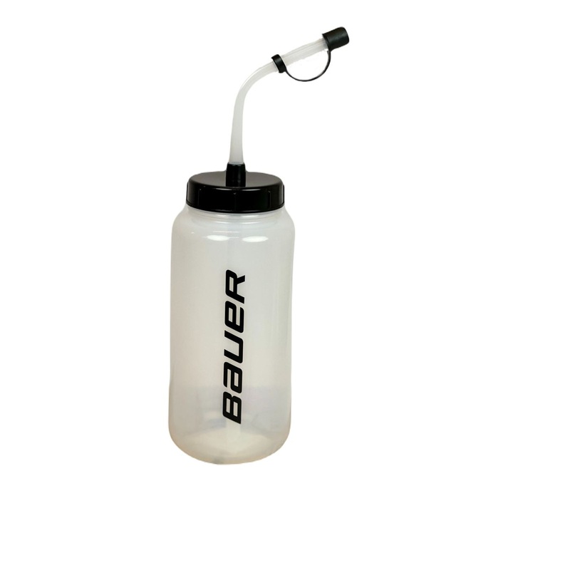 Description Water bottle from Bauer that holds 1 liter. Transparent bottle with a long straw that makes it easy to drink through the cage for younger players.