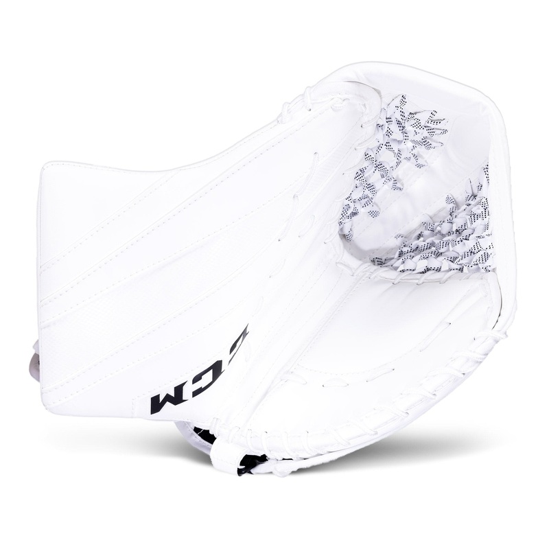The CCM Extreme Flex E5.5 Junior Goalie Catcher is a stock only color offering, available in the following colorways; Boston, Chicago, Detroit, Montreal, Toronto, All White, White / Black, and White / Navy. The E5.5 Catcher is available in Regular and Full Right hands.