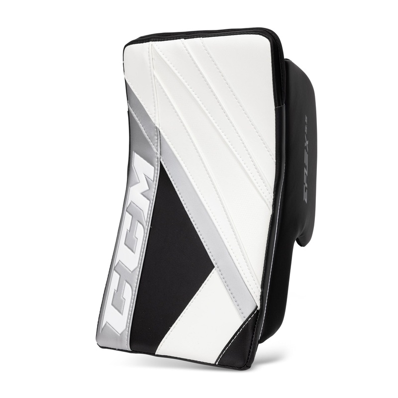 The Source for Sports Exclusive version of the CCM Extreme Flex E5.5 Senior Goalie Blocker offer a slight variation in color styling from the catalog E5.5 models. Colors offered in the CCM E5.5 Source Exclusive Blocker are; Boston, Chicago, Toronto, All Black, All White, White / Black, and White / Black / Silver. The E5.5 SDC Blocker is available in Regular and Full Right hands.
