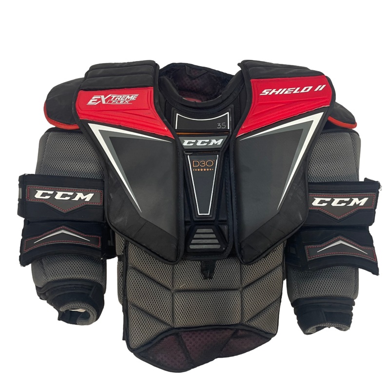 UXLF244655274251CCM Extreme Flex Shield II – Used Pro Stock Goalie Chest Protector (Black/Red)