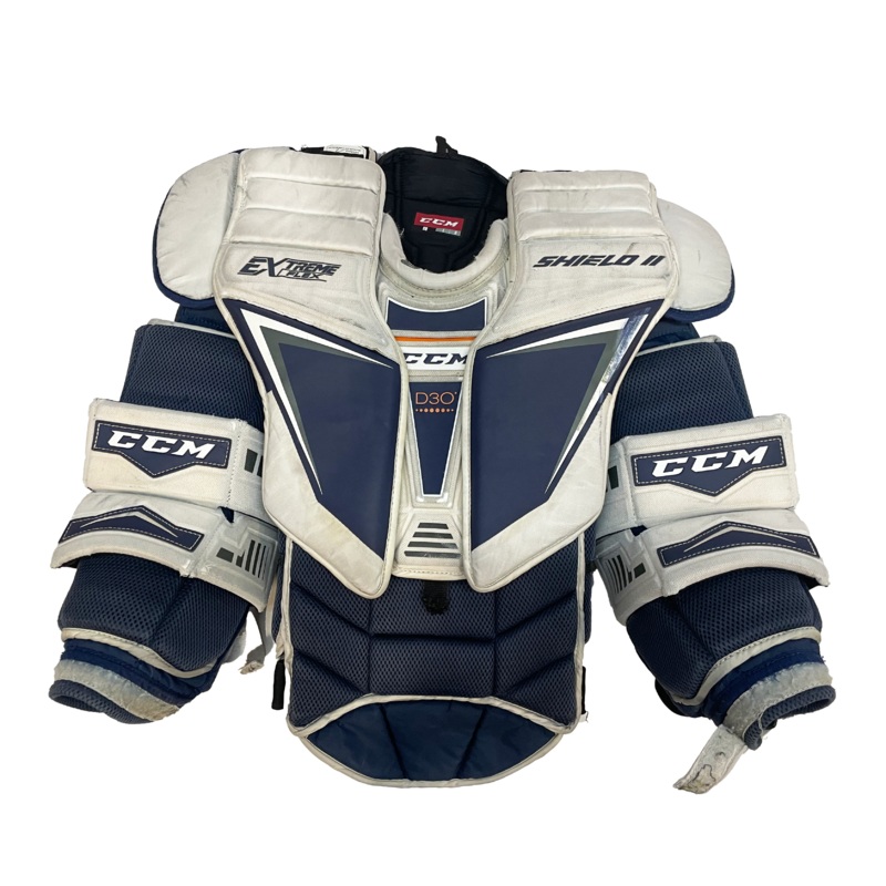 SO49590711CCM Extreme Flex Shield II – Used Pro Stock Goalie Chest Protector (White/Navy)