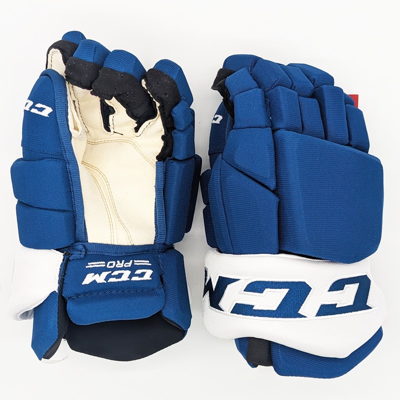 This pair of gloves are a CCM Tacks Pro Stock with added plate protection on the backhand.