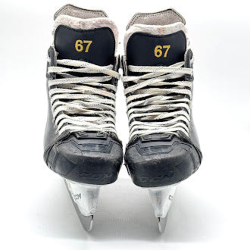 Size 6.5D featuring XS holders and used Step Black steel. Skates feature the number 67 on the tongue of each skate.. These skates are in very good used condition with very minor damages to the tendon guards.