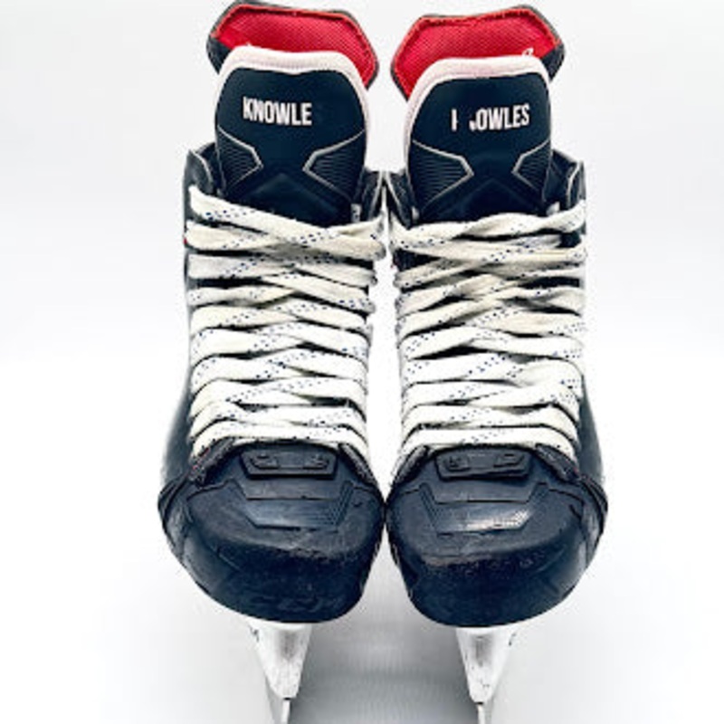 These skates come from Olivia Knowles of the PWHL. These skates are size 6D and feature 255 XS holders and custom Blade Tech steel with a Minnesota logo on the steel. Skates feature the name Knowles on the tongues and the number 24 on the heels.