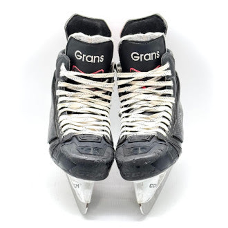 These skates are in good used condition with no major rips or areas of concern. There are some cosmetic blemishes on the skate but the overall structure of the boot and holder are in very good shape. Size 10D with 287 Speedblade XS holders and used stainless Step steel. These skates are equipped with shot blockers that can be easily removed. Featuring the name Grans accross each tongue.