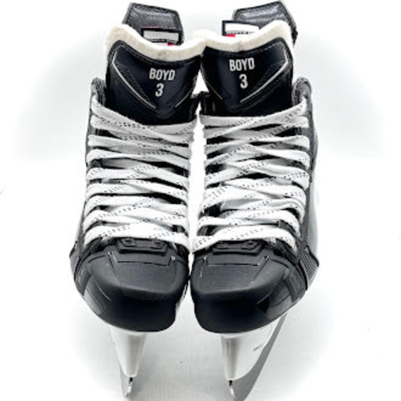 These skates are in excellent used condition with light wear. These skates appear to be size 6.5 with 263 CCM Reload Holders and Step Black Reload steel. Featuring the name Boyd across each tongue.