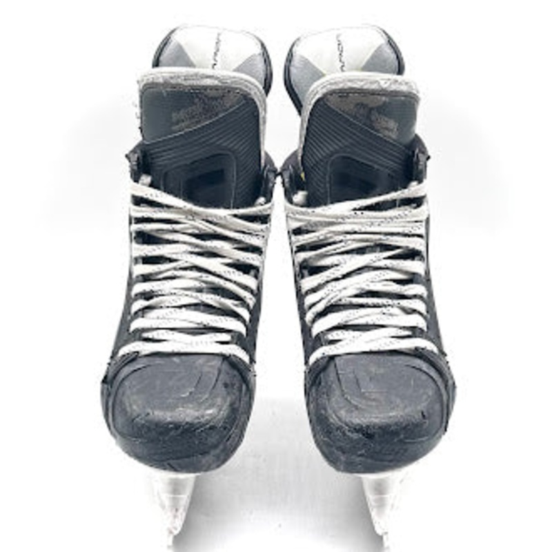 Equipped with size 254 Bauer Power Fly holder with used Fly-TI steel. These skates are in good used condition with minor cosmetic blemishes to the toe box and sides of the boot. Featuring the name Shelton across the tongues. These skates have lots of life left in them.