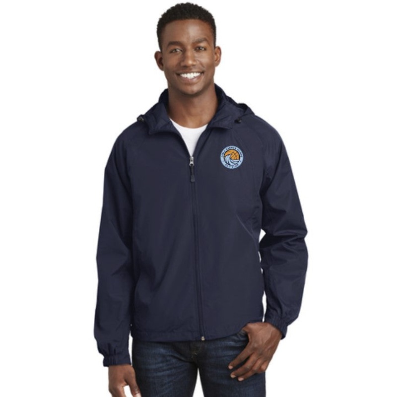 Navy Raglan Hooded Jacket with Harbor Hoops Embroidery logo on left chest.