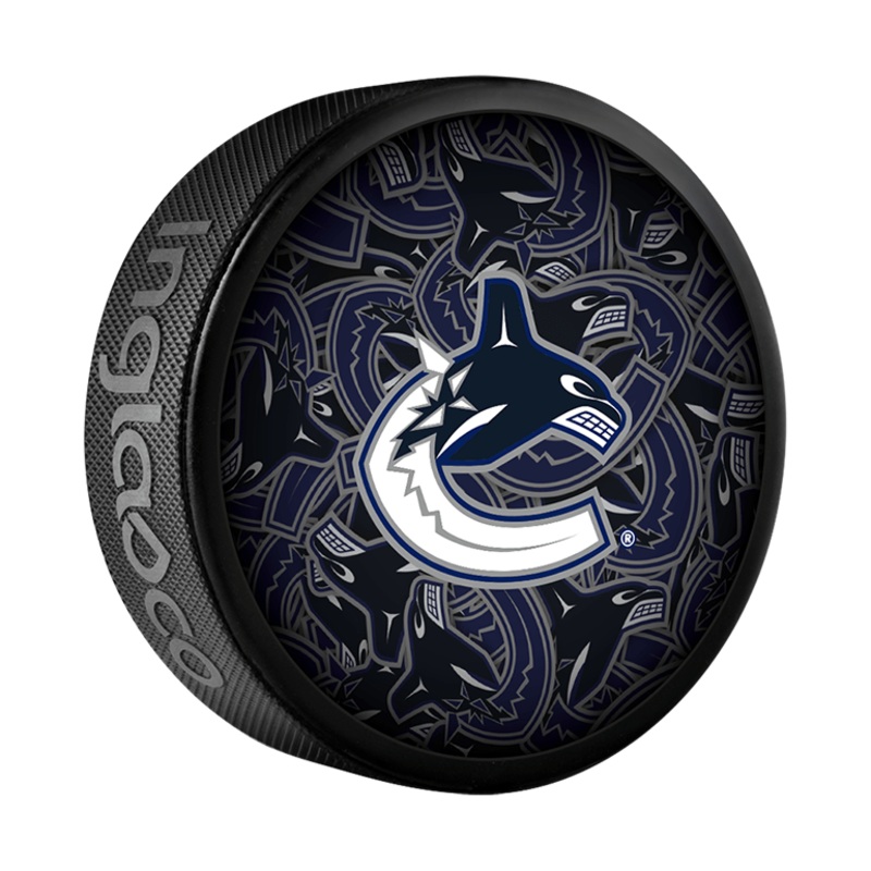 Celebrate the Vancouver Canucks with the NHL Clone Logo Puck by Inglasco. This puck features the Vancouver Canucks Orca logo in the center, with the Orca logo repeating in the background and darkened, which allows the main logo to stand out.