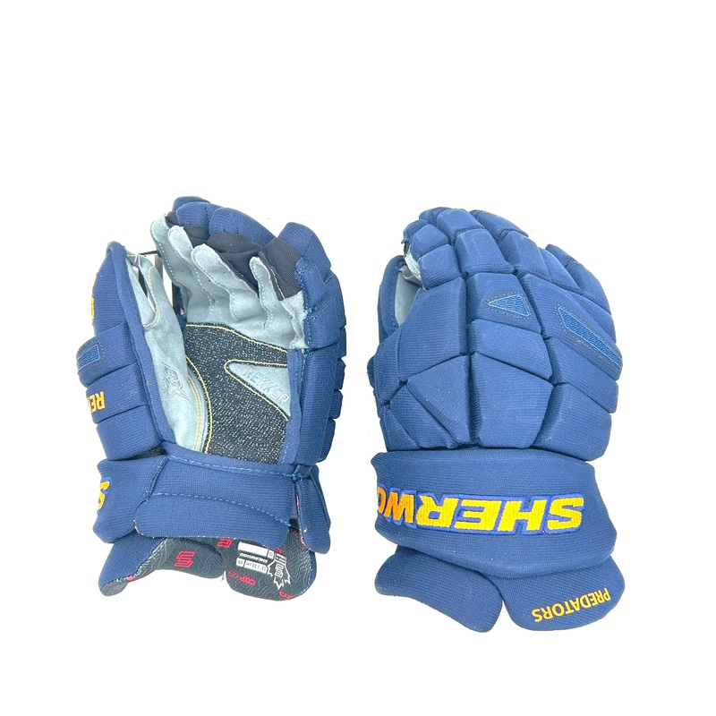 SHERWOOD REKKER LEGEND PRO NHL PRO STOCK GLOVE.These gloves are in the Nashville Predators Stadium Series colorway.NHL pro buildAX Suede 10W90 dark-gray palmstactile grip reinforcementstretch mesh gussetpoly-knit shell