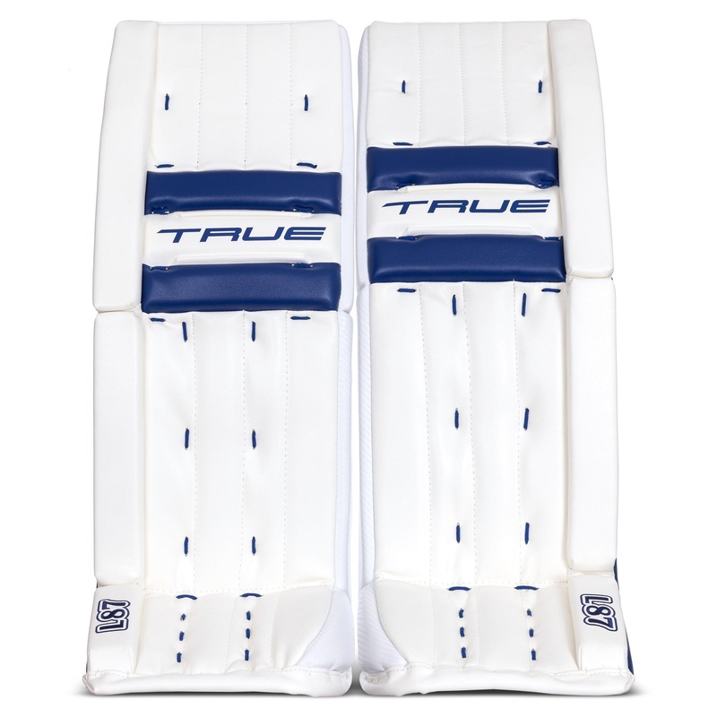 The TRUE Catalyst L87 Intermediate Goalie Leg Pads come in sizes 29-31 with a +2 addition as well. They also come in Black, Black/Red/White, Black/Yellow/White, Tan/Black/White, Tan/Green/White, White/Black, White/Royal/Red, White/Red, White/Royal, and White.