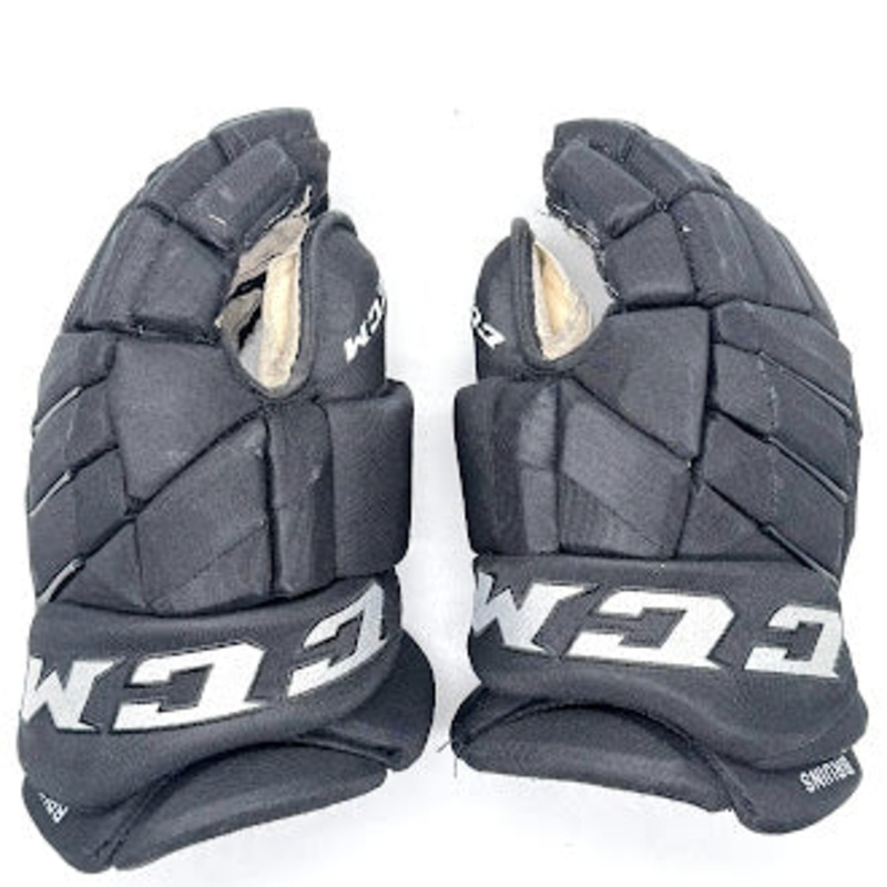 Used CCM HPTK pro stock gloves featuring the name Bruins on the cuff. These gloves are in very good used condition with one minor rip in the first layer of the left palm, but it does not go right through the palm.