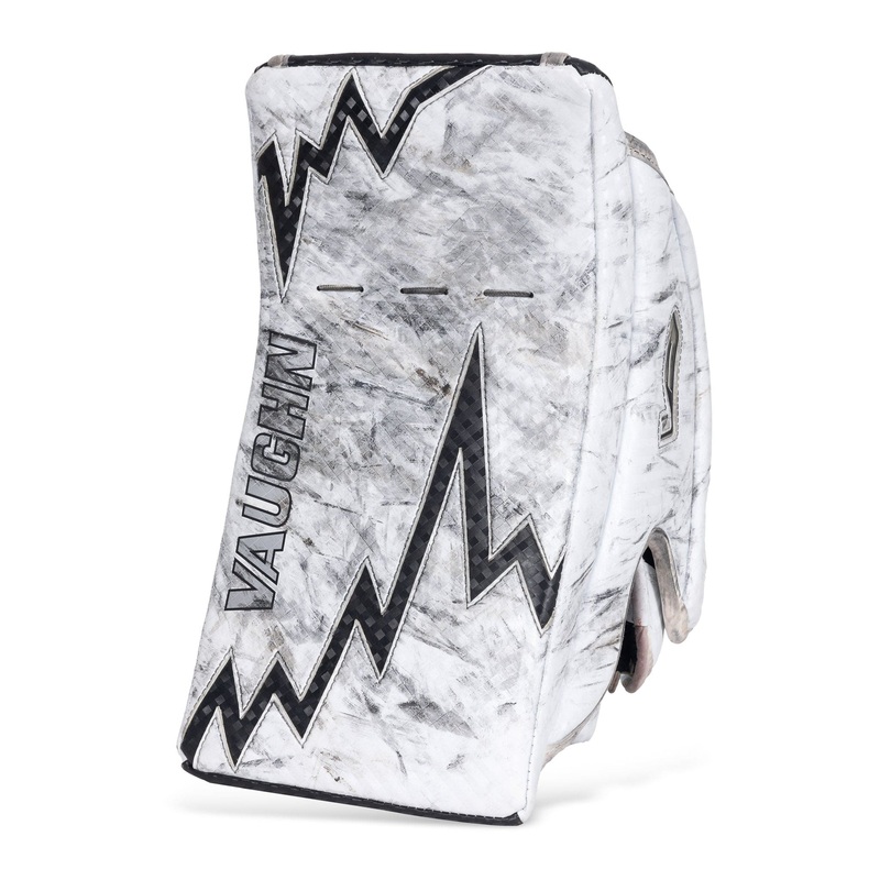 The Vaughn Velocity V9 Pro Carbon SR Goalie Blocker is designed for the elite goaltender who wants a lightweight balanced blocker. The V9 Pro Carbon features a bindingless board design offering maximum coverage along with Pure Carbon inserts on the face of the board, sidewall, thumb and composite finger protector offering superior protection, stiffness and reinforcement. A redesigned soft, comfortable nash and suregrip palm features a seamless index and small finger offering a more comfortable and durable feel while a thumb pillow and a soft padded cuff offers increased protection. Finally, as with all pro level Vaughn gear, custom colours, graphics and other options are all available.