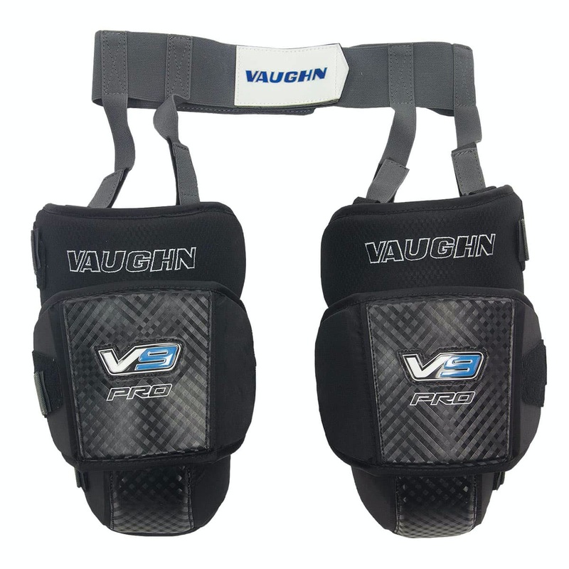The Vaughn Velocity V9 Pro Senior Goalie Knee Pads use a pro style three piece hinged design allowing for great flexibility. A large double shield knee design is laced on allowing for superior adjustment built from moulded HD plastic pads wrapped in a dura