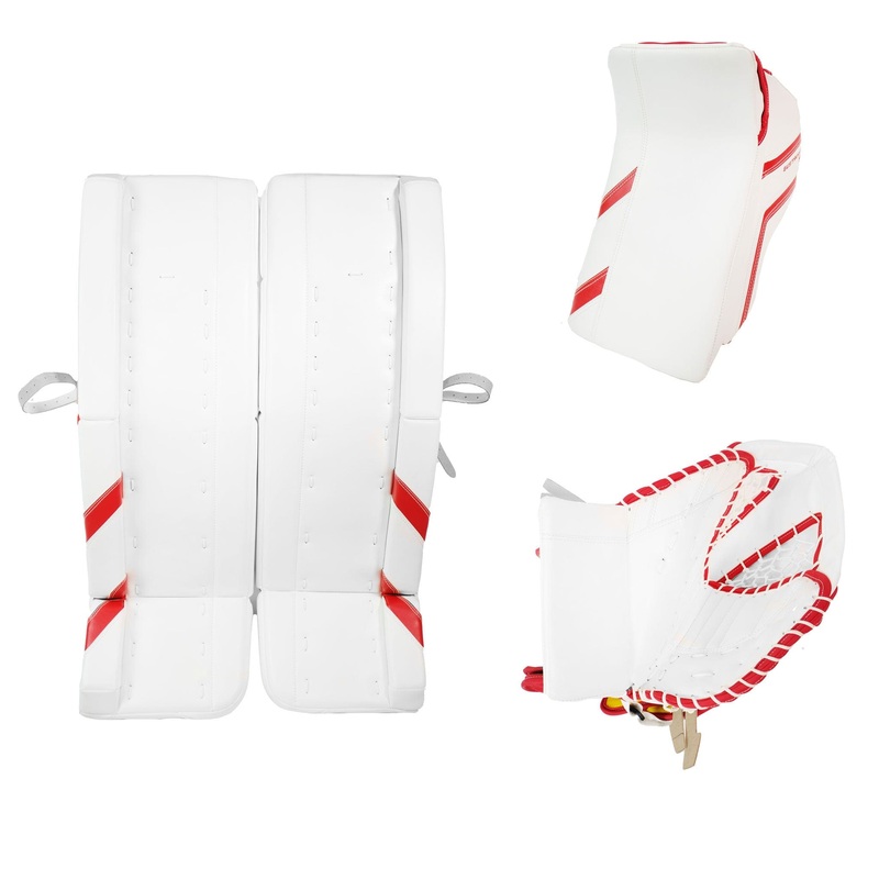 This custom Warrior G2 Pro goalie set is a pro return from NHL goalie Jonas Gustavsson. This is a full set including leg pads, catcher, and blocker and has been outfitted with Gustavssons specs and preferences, including various custom features, custom construction, and a unique non-branded Detroit Red Wings graphics.