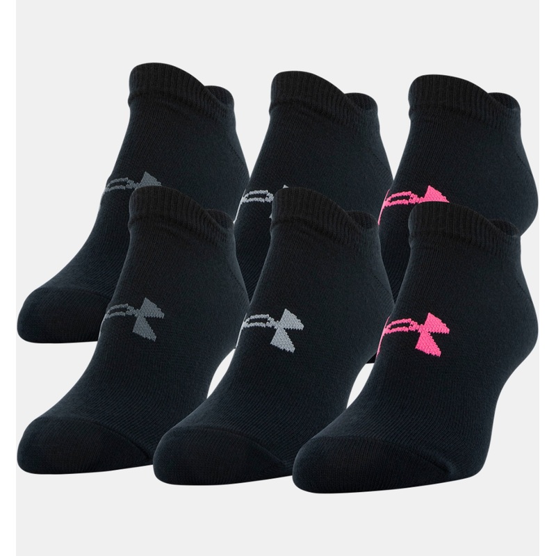 These women’s UNDER ARMOUR Essential No Show cerise/white/grey athletic socks treat you with the right support and comfort. Boasting of an adaptive flat knit construction for great touch and feel, this 6-pack has moisture-wicking polyester, nylon and elastane construction, odor-wicking anti-odor technology, flattering new stitch design, and embedded arch support to minimize foot fatigue.